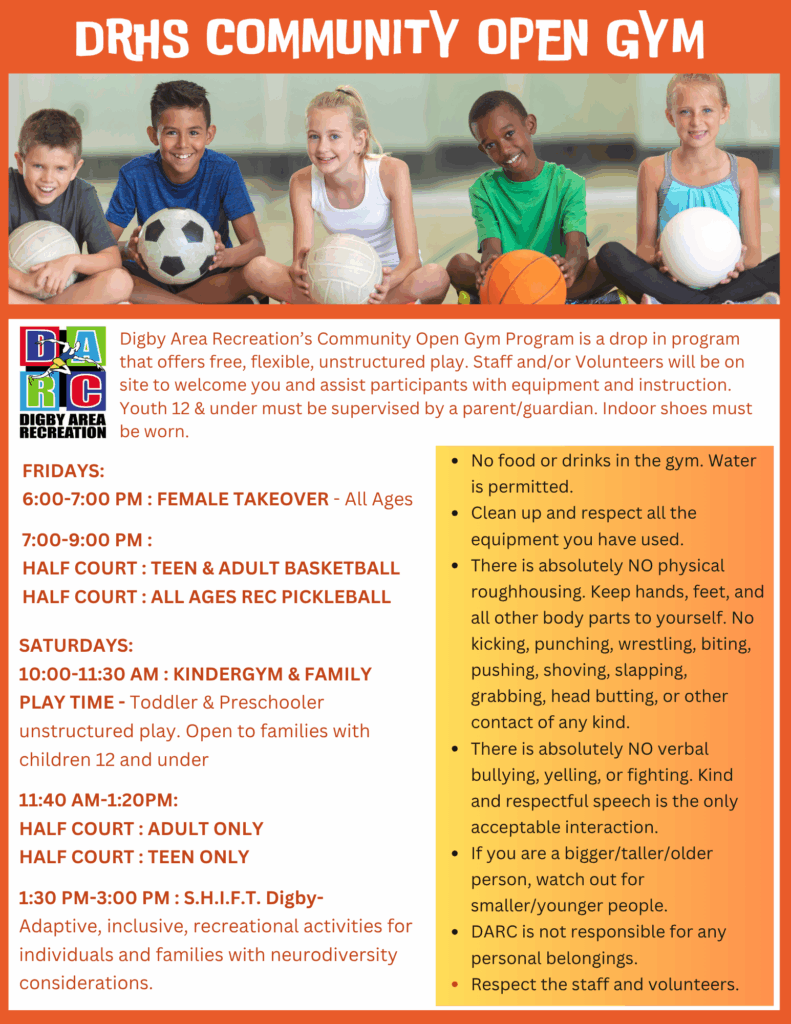 Digby Area Recreation Commission is committed to providing welcoming and safe environments where everyone can participate in a variety of recreational activities regardless of age, ability, background and economic status. We strive to support your healthy and active lifestyle.