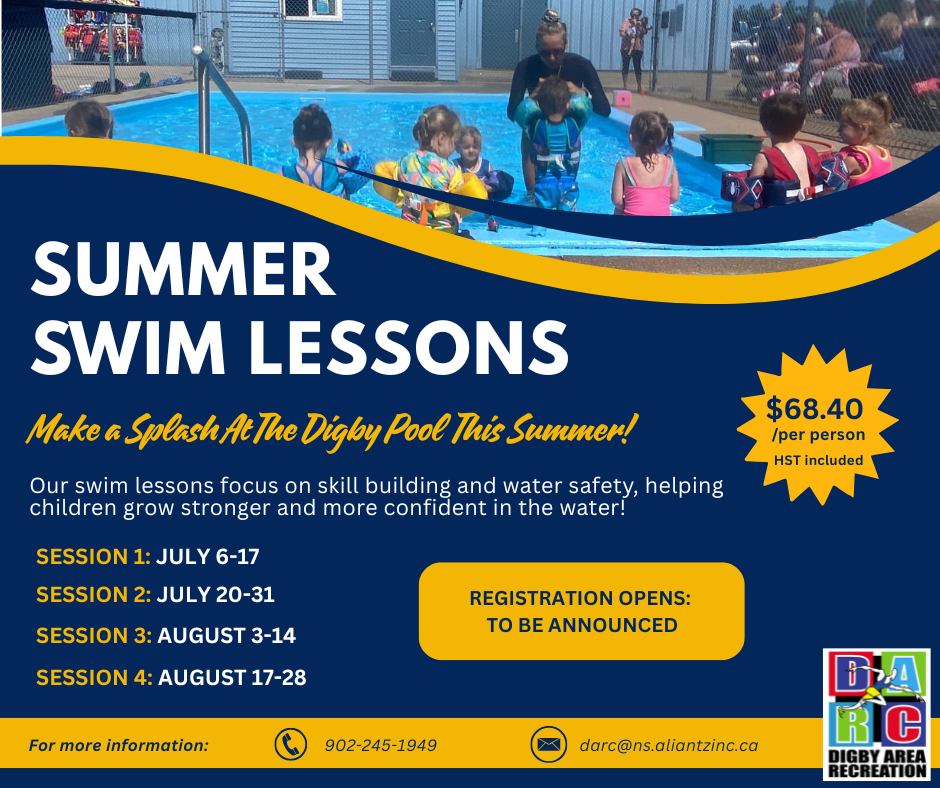 The Digby Swimming Pool offers a variety for programming including aquafit, senior swims, lane swims, public swims, specialized swimming sessions, private bookings, as well as our very popular children’s swim lessons. All staff are certified by the National Lifesaving Society. Facility staff are certified and registered by the National Swimming Pool Foundation.